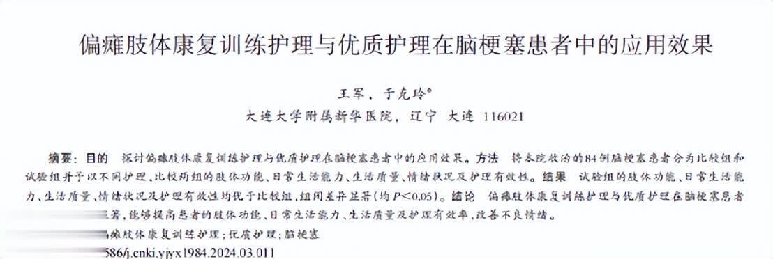 参考资料[1]王军.偏瘫肢体康复训练护理与优质护理在脑梗塞患者中的应用效果,中国冶金工业医学杂志,2024-06-04